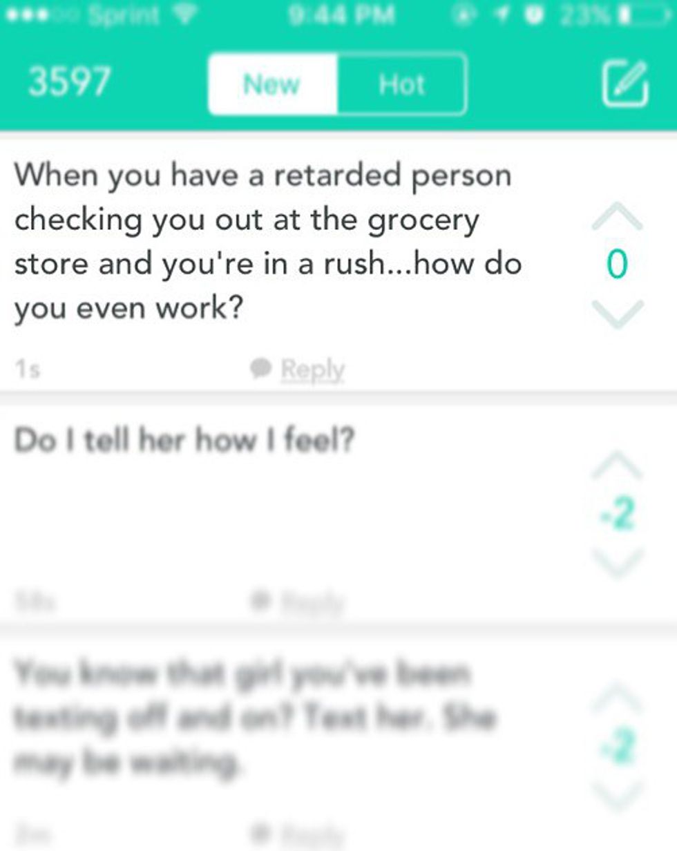I am tired of hearing of people's disdain for “political correctness.” Not using the R-word isn't just being politically correct, it is simply having basic human decency. For me, these feelings come from a place very close to my heart. In high school, I was fortunate enough to be a part of "Best Buddies", as well as to volunteer as an intern in adaptive PE. I have been beyond fortunate to know a group of extraordinary people who have changed my life and inspire me every day. Students who have made me laugh or smile even on my worst days.These students are amazing individuals who love basketball, going to movies, hanging out, and are just some of the best friends you can ever have. They are family, and they are complex and brilliant and funny and they cannot be defined by the R-word. It pains me to hear any of my peers use the word, especially in as cruel as a way as this Yik Yak did. And saying things like "Oh, I know it bothers you, so I won't use it when you're around," is just as bad, because that doesn’t actually signify respect for me or the power that words have. It just helps you sleep at night. Maybe if people saw the personal implications that come from using the R-word, if people could understand the ostracizing effects of labeling people, they would feel more opted to eliminate it from their vocabulary. The problem is that people who don't empathize when they are using hurtful words can't view the insult from the receiving end. They can't feel the pain. They forget about how it feels when they are put down, labeled, and insulted.So to the person who decided to use the R-word today. Every person is unique and special and deserves to be recognized by his or her individuality, not a label. If you can shrug off insults or words that hurt you, good for you. But there are millions of us who can’t, and shouldn't have to. There are millions of us who are personally affected by your cruel words, and it just isn't right. You may not have even intended for your words to be malicious (though I feel you did), but your words do hurt. You may think that this was just a comment that would go unnoticed, but I can assure you that that is not the case, even if you hide behind a veil of ignorance and anonymity.