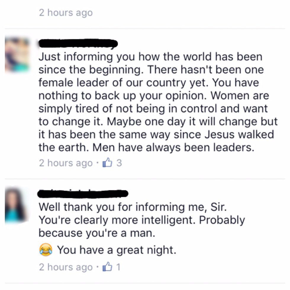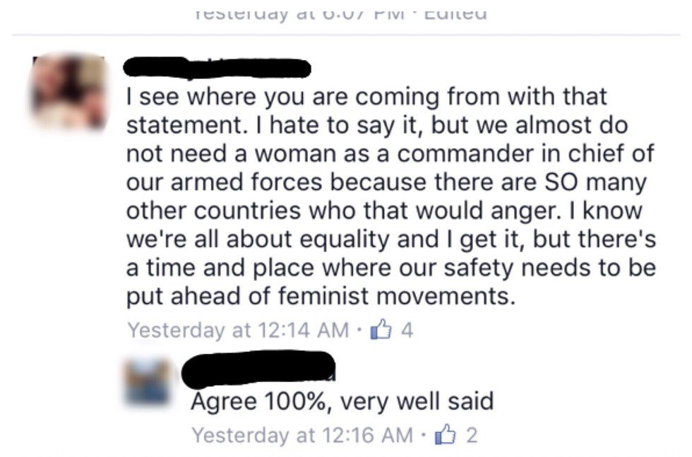 As you can see, this person is concerned about our safety, unlike the rest of the United States citizens who want to elect Clinton. This person wants to make sure that other countries don't become angered with us for having a female leader. With the current buzz surrounding ISIS and the Middle East, I'm sure this person means that we, as a country, do not want to anger countries in which Islam is practiced. Good. It would be a shame to have Hillary Clinton as the president at the same time that Muslim women like Megawati Sukarnoputri (President of Indonesia), Sheikh Hasina Wajed (Prime Minister of Bangladesh), Atifete Jahjaga (President of Kosovo), or Bibi Ameenah Firdaus Gurib-Fakim (President of Mauritius) are leading. It's a proven fact that all women want to do is bicker... could you imagine a cat fight between the US and the previously listed countries? Even worse. What if they all got their periods at the same time? World War III, my friends.