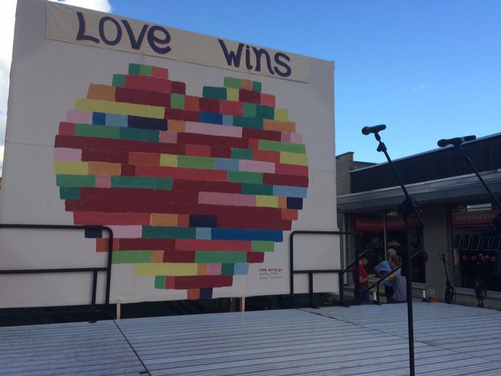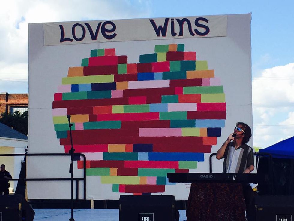 This year, many vendors lined the streets in downtown Lafayette to provide some free swag like sunglasses and buttons and to provide resources that showed their support for the LGBTQ+ community. Performances were held throughout the evening on two different stages, one with a rainbow, brick heart background that said "Love Wins" and another with a rainbow swirl background.