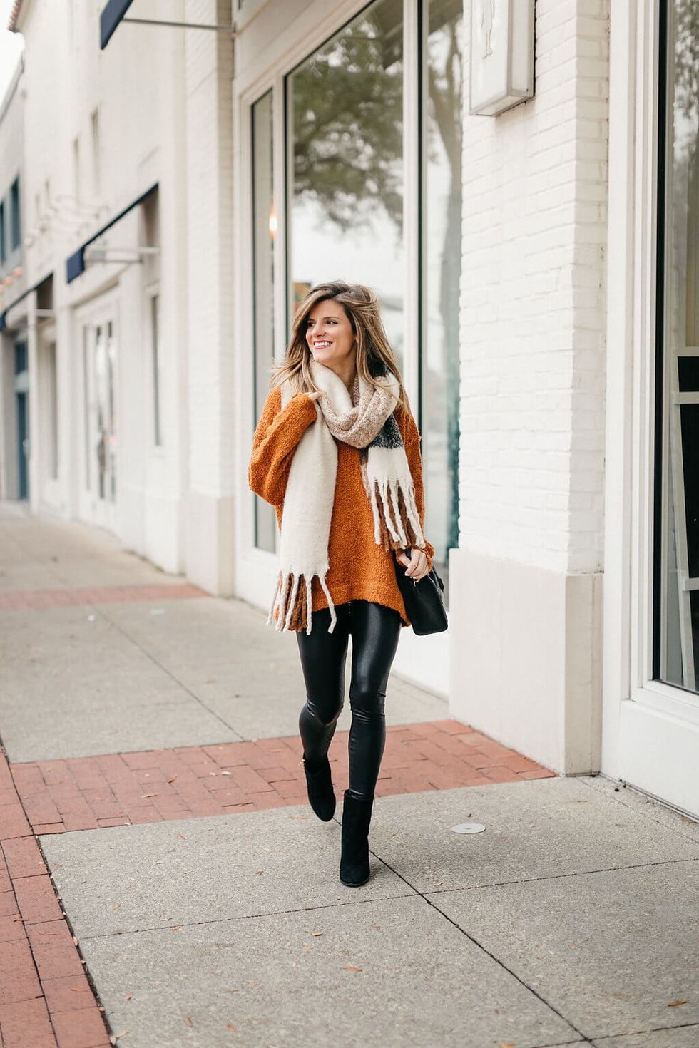 This outfit is super cute and trendy for Thanksgiving. The pumpkin colored sweater brings a fall feel to your outfit. The sweater will keep you warm and the leather pants are very unique. Adding a scarf makes this outfit and pulls together the whole look. Add some suede booties and a cross body bag to finish off the outfit!