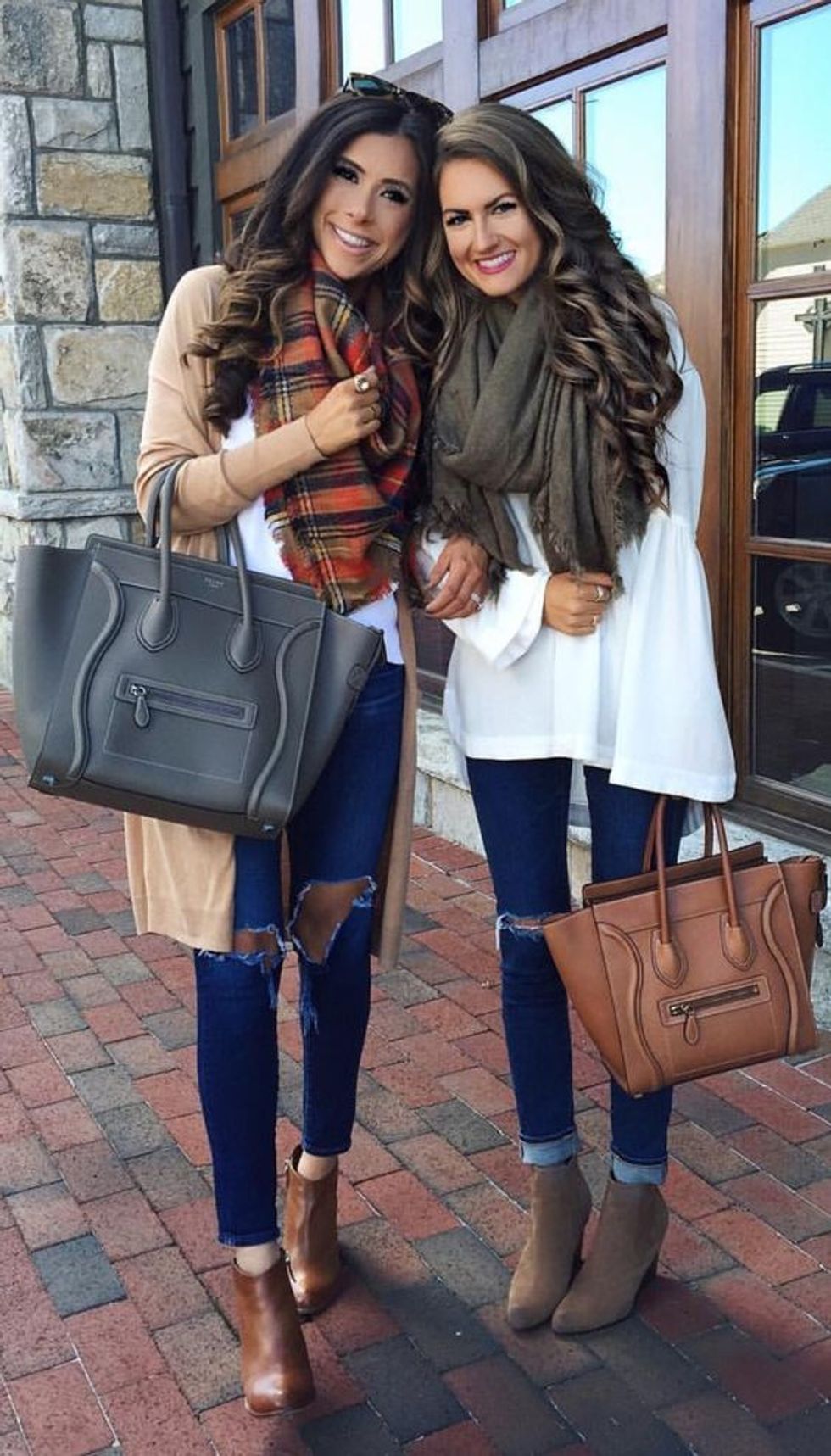This outfit idea is another great option for Thanksgiving. The white blouse gives a very clean look and looks great with classic blue jeans. You can roll the jeans up to give more detail or leave them be. The outfit looks great with a pair of leather or suede booties which help to dress up the look a bit. Give some color and texture to the blouse by adding your favorite scarf. I prefer plaid scarves which have orange, browns and burgundy tones which give an autumn aesthetic. Add a bag, fun rings or even a pair of sunglasses to accessorize!