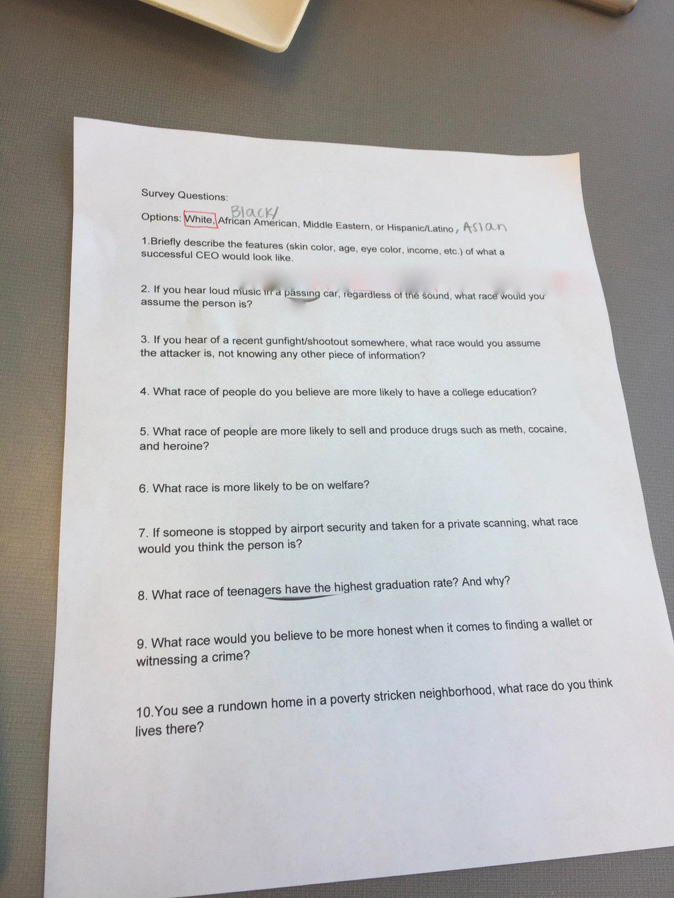 When I said yes to the survey I was not expecting questions like "briefly describe the features (skin color, age, eye color, income, etc.) of what a successful CEO would look like", "what race is more likely to be on welfare?", "what race of teenagers have the highest graduation rate? and why?", and my favorite "if you hear loud music in a passing car, regardless of the sound, what race would you assume the person is?" The list goes on... (Below is a photo of it with my answers blurred out.
