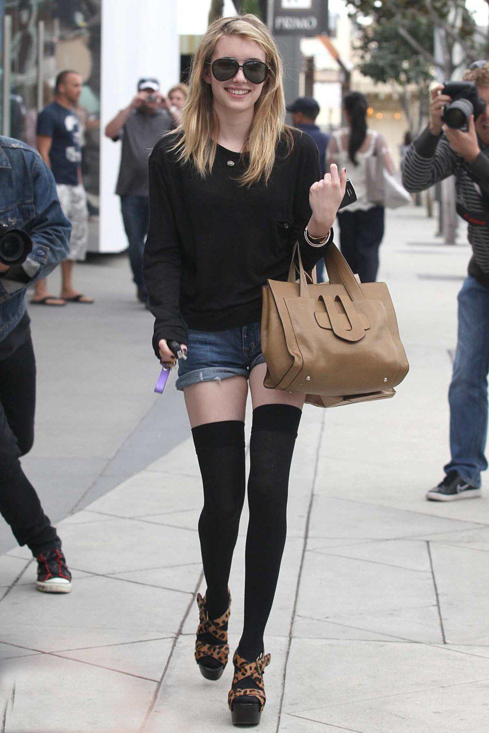 Thigh-high boots slowly began to show up again in fashion shows from 2009 to 2015. In previous years they were not as prominent in stores as they are today. For fall 2015, the biggest trend was wearing booties, sneakers, or wedges with a pair of thigh-high socks. But there is no need to worry about that now when you have the thigh-high boot. With many brands and colors to choose from, it will be easy to stay on top of this trend. Below you will see Emma Roberts wearing last year's style of thigh-high socks with a pair of cheetah wedges to make her outfit stand out: