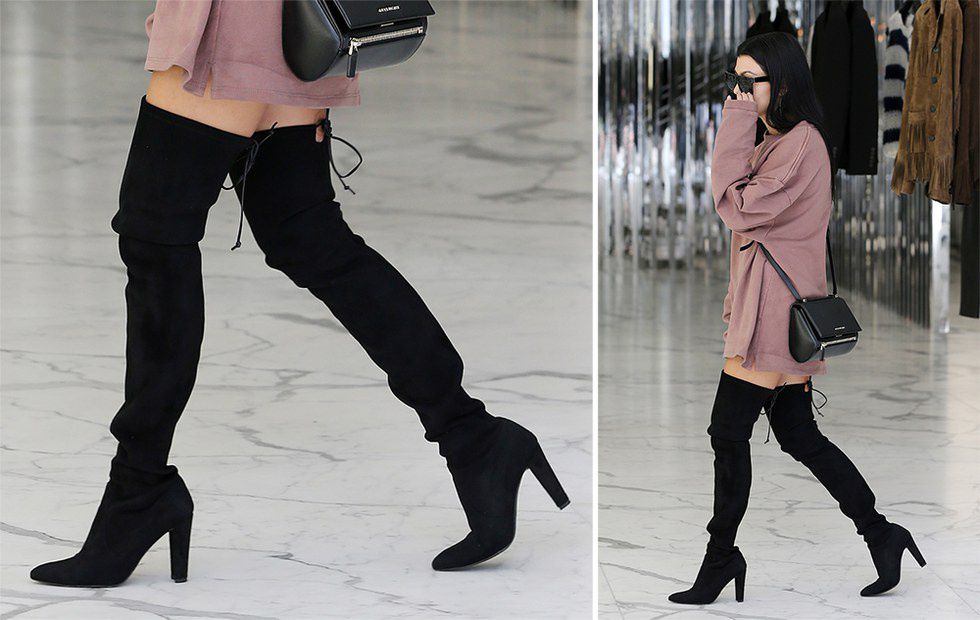 Thigh-high boots can go with several outfit styles. They go perfect with a minidress when the weather is a bit warmer. They add a pop to your outfit and making you stand out! They are even better when worn with leggings and a comfy sweater. They keep you warm and stylish through the winter breeze. The boots have also become popular to wear for work. Wearing them with a pencil skirt and button down keeps the outfit classy, yet trendy. Another possible way to wear them is with an oversized hoodie. This style has been worn by Karrueche Tran and Kourtney Kardashian. This comfortable style makes your legs look longer than ever. So for whatever occasion you are dressing for, these boots will match and add style to just about anything! Below is Kourtney Kardashian strutting in her Stuart Weitzman black lace up thigh high boots for the 2016 season: