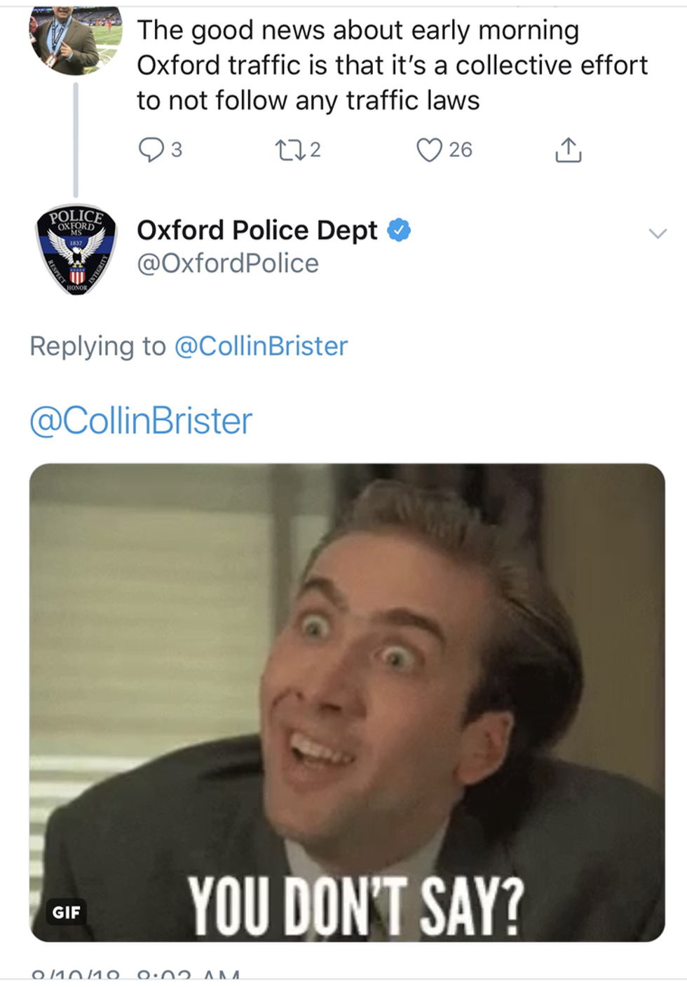 Oxford and The University of Mississippi have so much to offer to its residents and students. We have the prettiest campus, filled with tulips in the spring. We have the grove, the square with endless amounts of amazing food, a close-knit community, but my personal favorite, we have the Oxford Police Department's Twitter. OPD graces us as members of Oxford's community with constant laughs, updates, and gifs. Here are the just ten of the many, many times OPD was "savage AF."