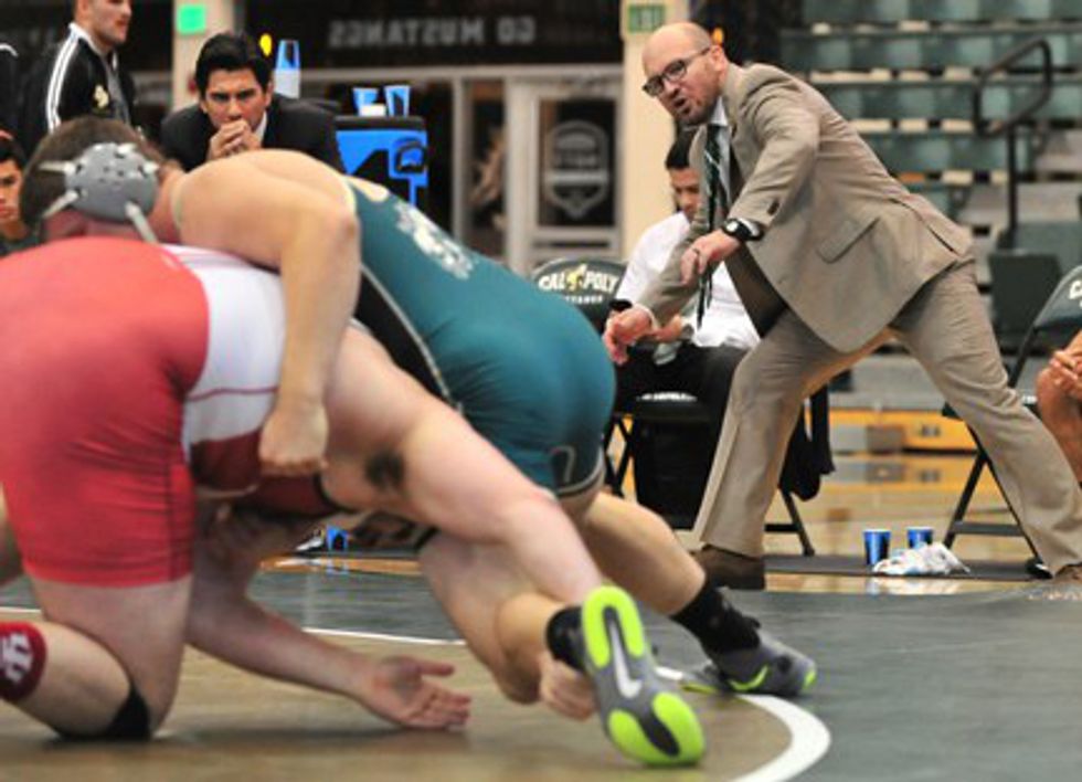 (Coaches Mike Hatcher and Jon Sioredas of Cal Poly, background)