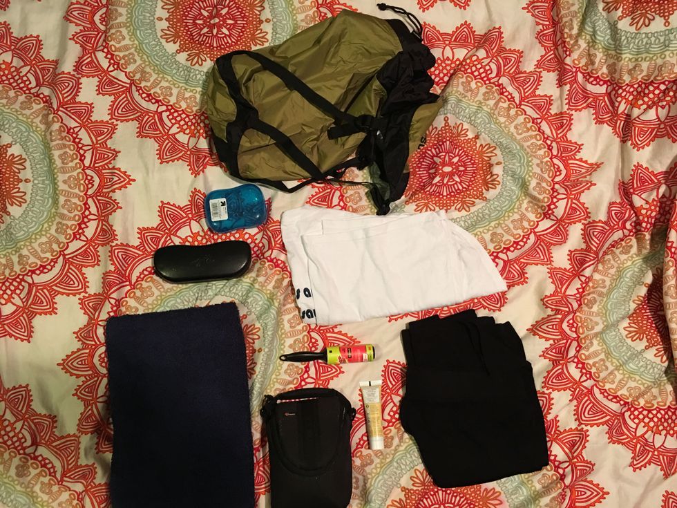 On my first try, I could (barely) fit everything in my bag with the exception of my camera. So, I decided to rethink my definition of necessity. I decided that I didn't need my bulky camera because I have a phone and a GoPro to take pictures with. Next to go was the maxi skirt, because let's be honest...was I really going to wear it anyway? I also got rid of my glasses (they are more for reading, night driving, and computer work), and a few non-essential items from my toiletry bag. I put the remaining items back in my bag, but I still wasn't satisfied.