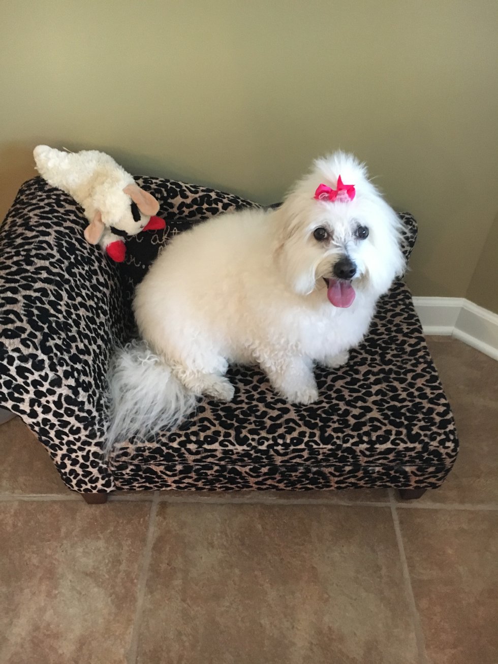She was like a cotton ball who was so tiny when we took her home. She would always follow me around like I was her mom. She only liked to sleep in my bedroom at night opposed to my sisters' rooms. When no one was there to comfort me, she was right there. Every time I would cry, she would be right there with me, howling to let me know that she didn't like to see me sad. We would run around the backyard for hours just playing. In the summer, we had a pond behind our house. Phoebe always felt the need to chase the geese. At some point, she would even go as far as in the pond and my mom would have to clean her up. She was so white and the pond made her green. There was once a skunk and of course, she decided to chase it. Well, the skunk decided to give her a taste of her own medicine and sprayed her. I remember she would just stand on the porch smelling terrible and she would sneeze then look confused as to why she was sneezing. She just smiled through the whole thing.