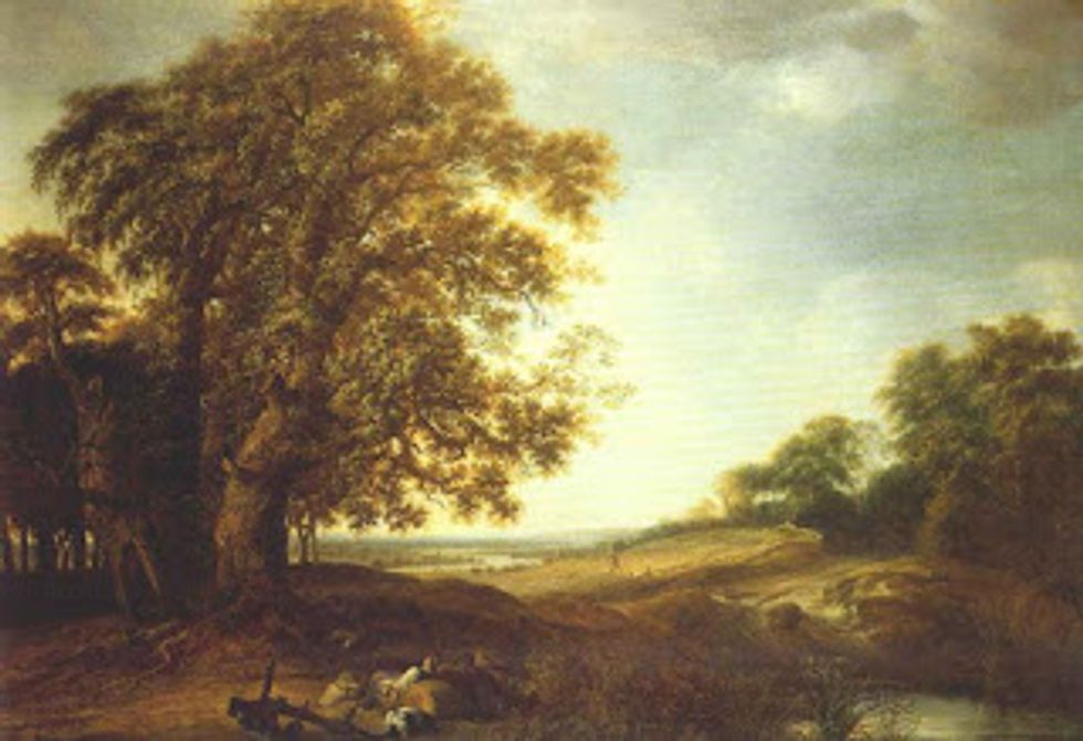 17th century artists would paint with really cool oil paints that were very vibrant and colorful and dazzling. Then their paintings would be hung up in cathedrals and homes. These places were hot--thanks to lack of A/C and candles. The heat caused the paints to slowly undergo chemical reactions which dulled the colors of the paint and turned the grass brown and the blue skies grey. Take a look at Simon de Vlieger's Wooded Landscape with Sleeping Peasants: