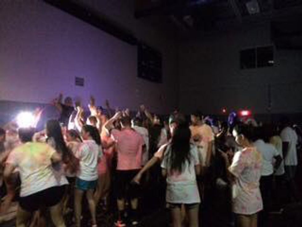 At first, my friends and I walked in the building it was being held, and we saw a huge long black tarp covering the floor, and towards the front a huge DJ table, speakers, two guys, and lots of paint buckets. So we immediately started in with dancing that was already there.