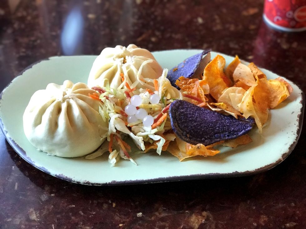 Hamburger beef along with pickles, onions, cheese, ketchup, and mustard is pulverized then stuffed into a bao bun. Bao buns are bready dumpling-like rolls that look very otherworldly when advertised as "Cheeseburger Steamed Pods." It is served with house-made vegetable chips and coleslaw. He said it was good, but each bite basically tasted like a McDonald's hamburger with a lot of bread on the outside. There is also a curry vegetable option for vegetarians which sounds like it would taste a bit better than the cheeseburger pods.