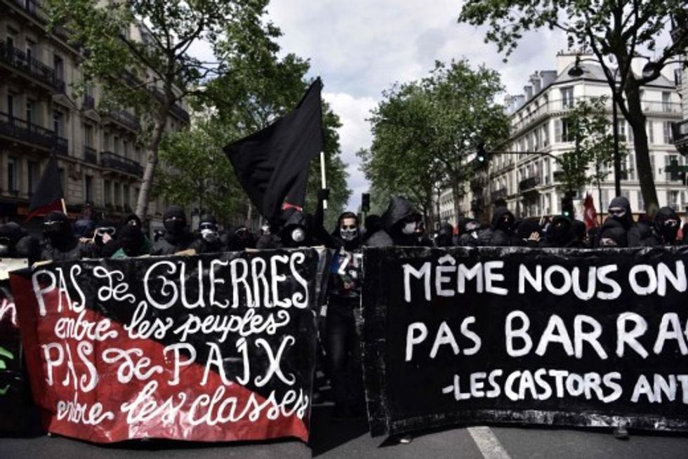 French protestors, wearing all-black and holding an anarcho-communist flag.