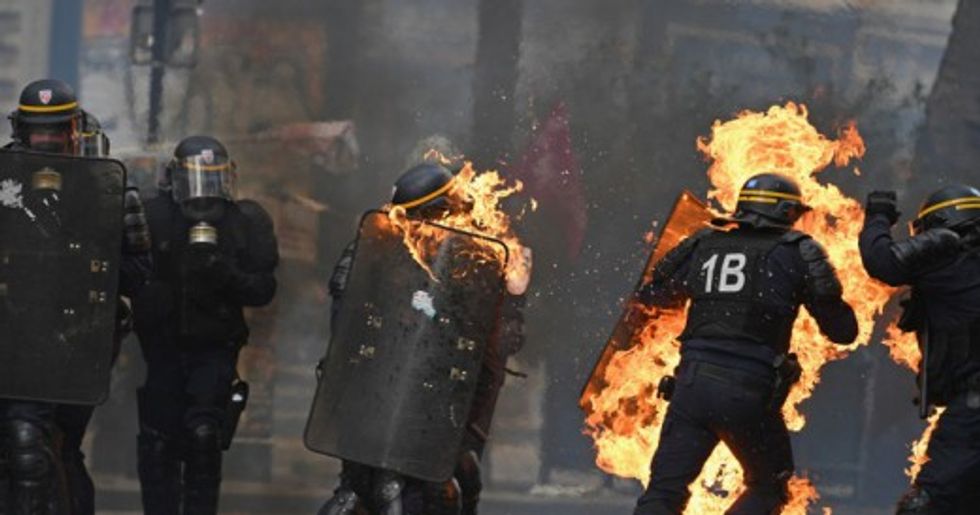On this May 1st, however, it appears the tradition of giving flowers has been replaced by giving Molotov cocktails and bottles to their fellow countrymen and women. Violent protesters have taken the streets, disrupting the event and assaulting police and Front Nationale supporters with a variety of weapons, even setting fire to multiple officers.