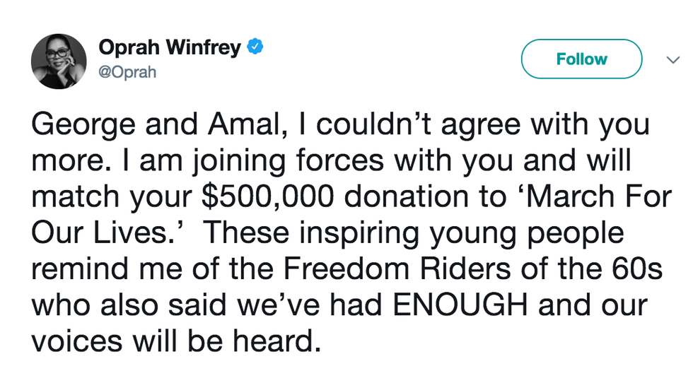 Talk show hosts like Stephen Colbert and James Corden have used their shows as platforms to promote "Never Again" and to amplify the students' voices. Several celebrities have also reached out and donated to the cause, including Oprah Winfrey.