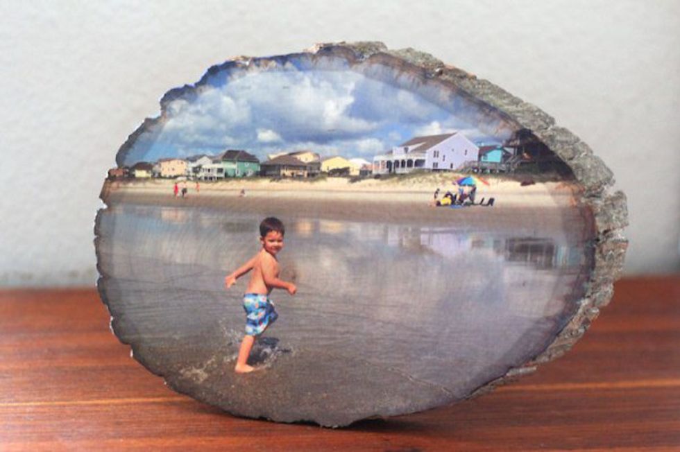 How it's done: Granted, this project is a little more difficult to pull off on the fly but it's cute and not hard to do once you have all the supplies. Cut around the photo leaving room for the wood slice. Then, remove the shiny, clear sheet from the tattoo paper with your photo, and place the wood slice down over the photo. Do this part carefully, because you can't adjust it later. Trim the photo around the wood to make it fit perfectly. Wet your washcloth and gently press it on the photo. The picture should start to show through as it's transferred from the paper to the wood.