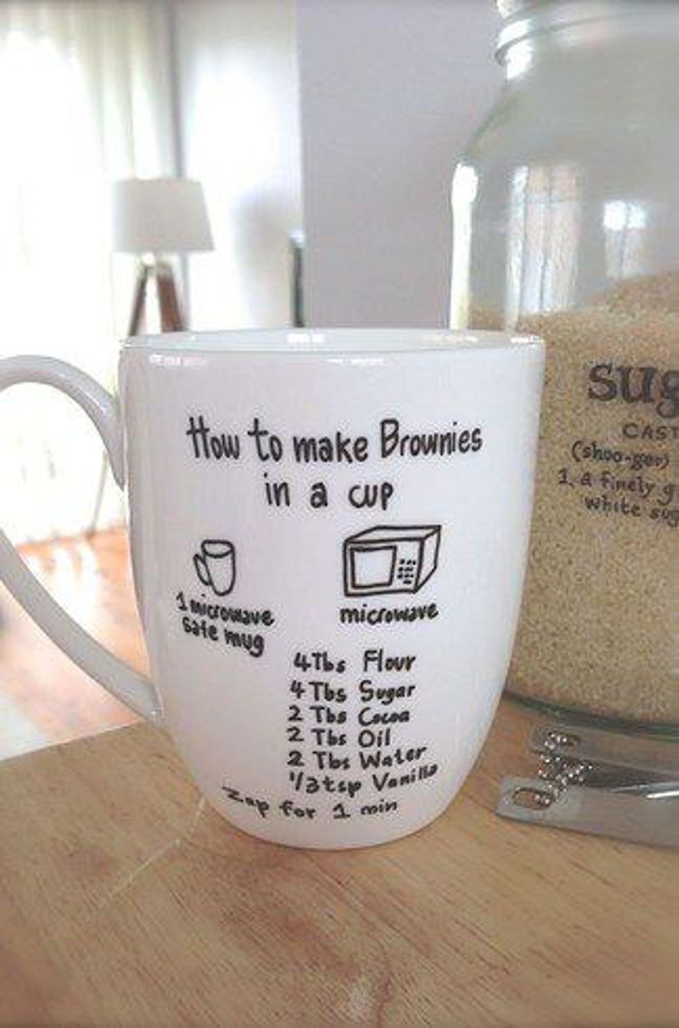 How it's done: With your sharpie, write those instructions above on the mug. This could be where you get creative and change the recipe a little but make sure it still cooks correctly since it's a microwavable recipe. Then, bake your mug on 350°F for 30 minutes, putting it in the oven before it's completely preheated and then letting it cool down completely after the 30 minutes. Wash afterwards when cooled.