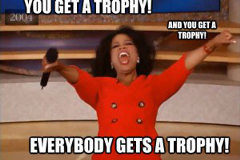 This is the problem with participation trophies. I think that they're an early start to a lousy work ethic. While it's good to be proud of children for everything they take part in, not everything deserves a trophy.