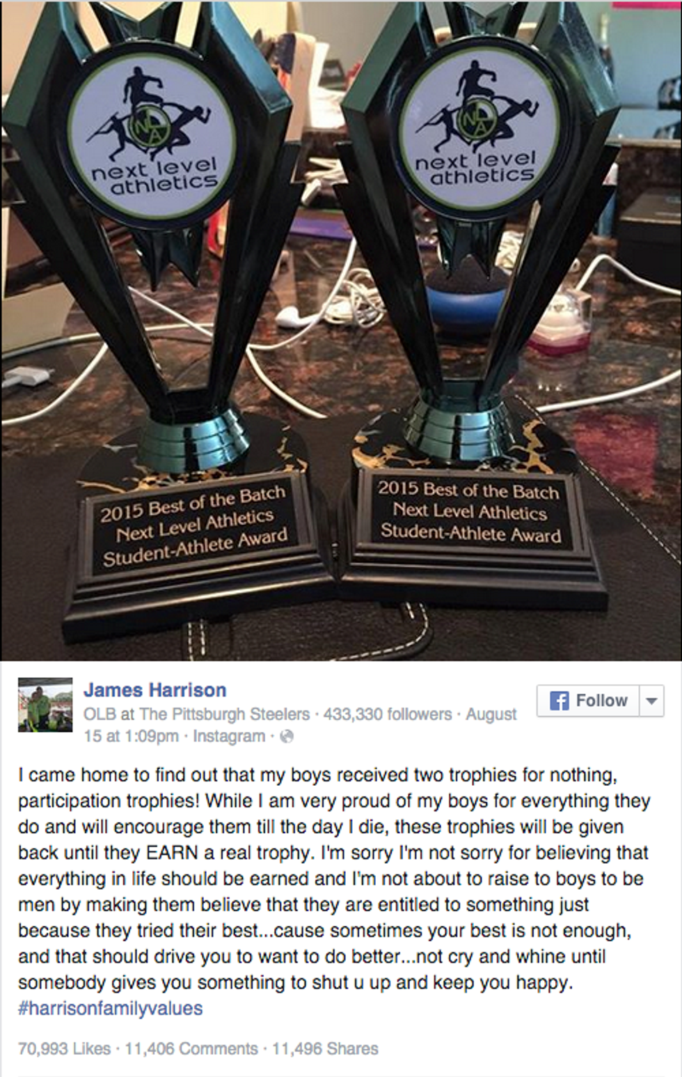 In 2015, Pittsburgh Steelers linebacker James Harrison sparked commentary when he posted images of his sons' participation trophies stating that he was going to confiscate them.