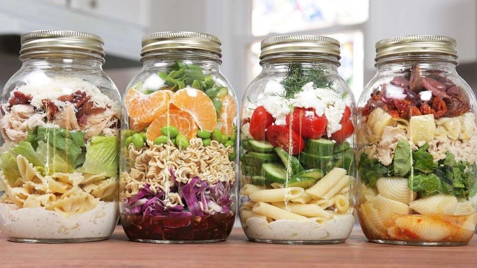 This is an adorable and easy way to take your lunch with you or give a gift to someone! Feel free to try different recipes in the jars.