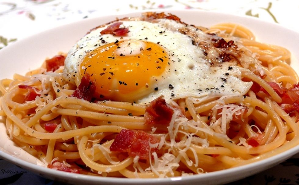 Add the noodles to the skillet and toss with the bacon until the noodles are coated in the bacon fat. Turn off the heat. Beat eggs with fork and mix them into the pasta with parmesan cheese.