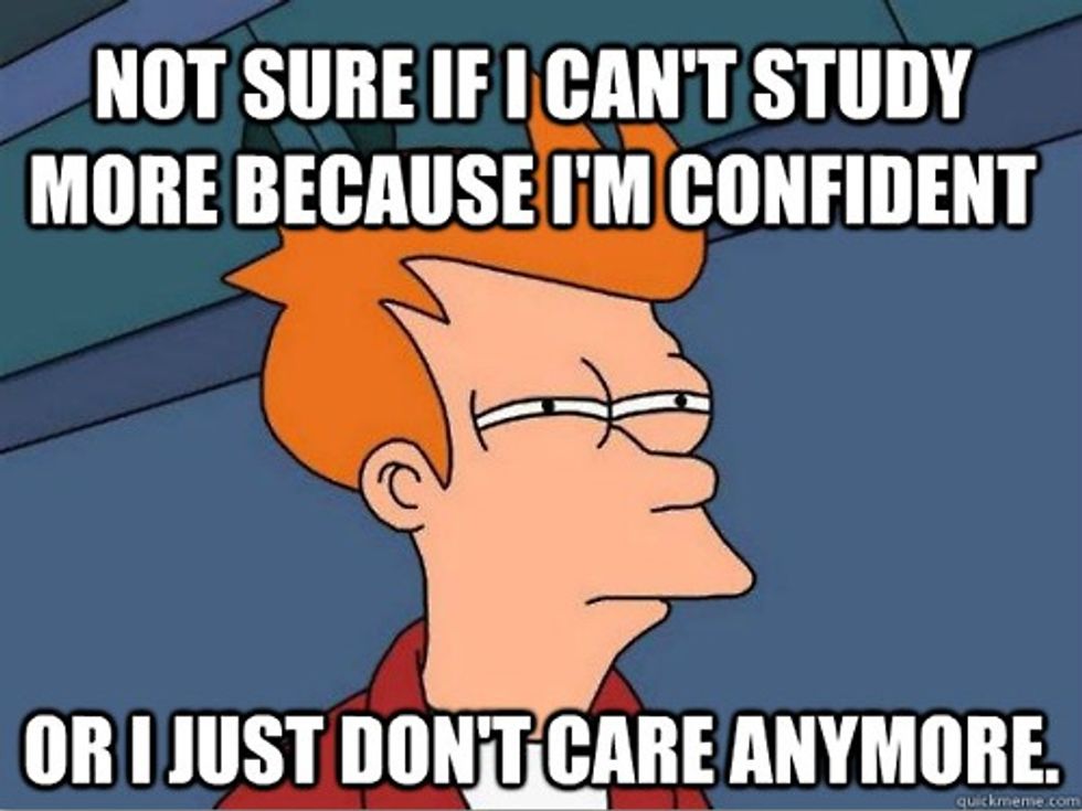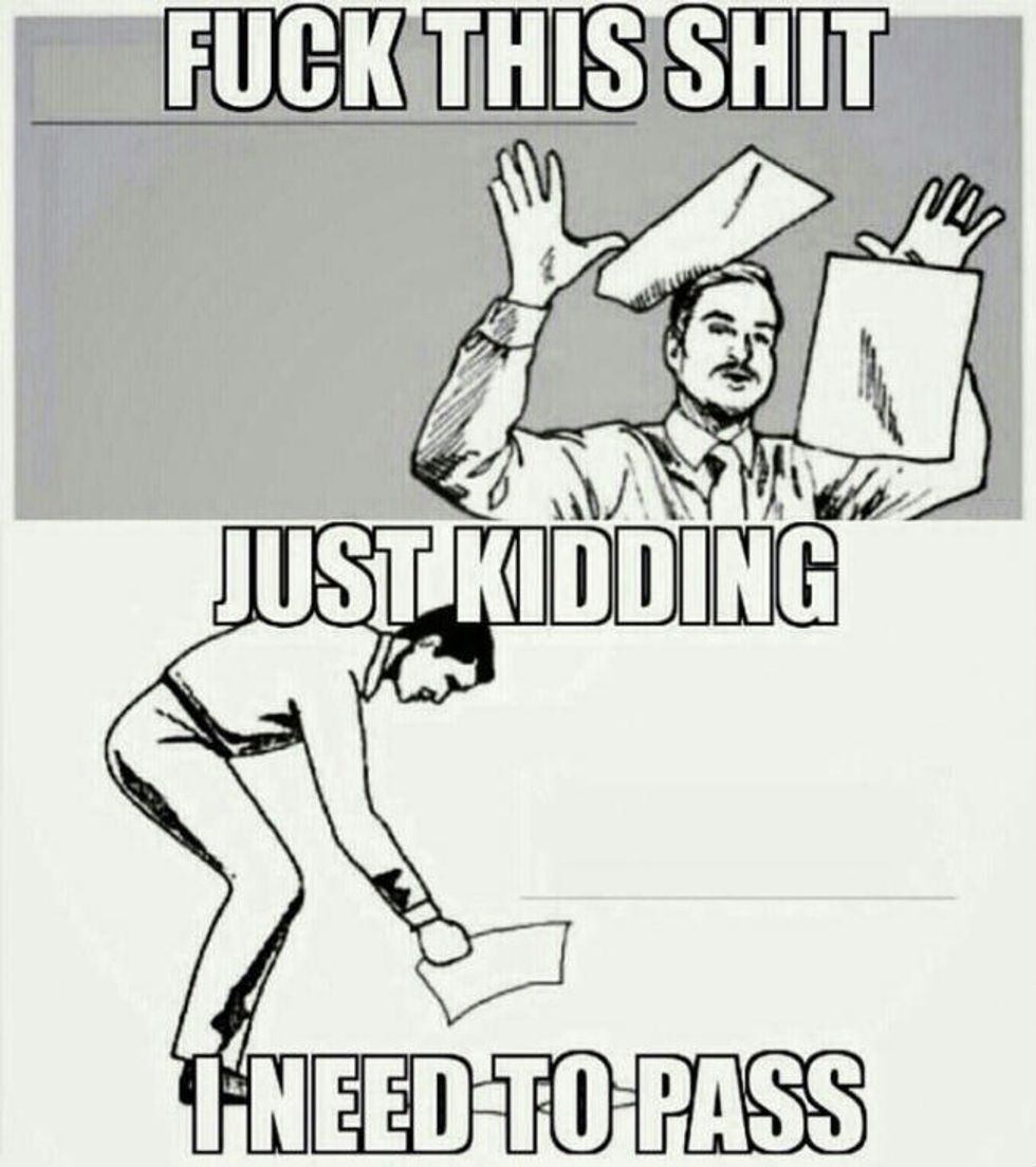 When you get to the point where you have studied and you feel like your brain is melting so you are ready to throw in the towel. But after realizing the badass life you want that starts with graduating college plus all the work you put into the class, you realize that you kinda need to pass.