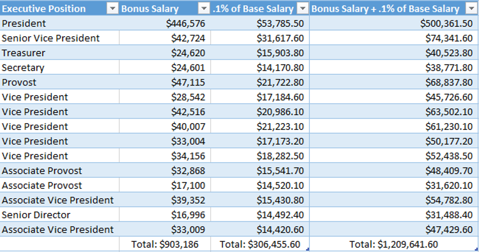In 2013, the top 15 executives made a base salary, plus extra compensation. If we take 10 percent of their base salaries and use 100 percent of their bonuses, $1,209,641.60 can be dispersed evenly among our adjuncts.