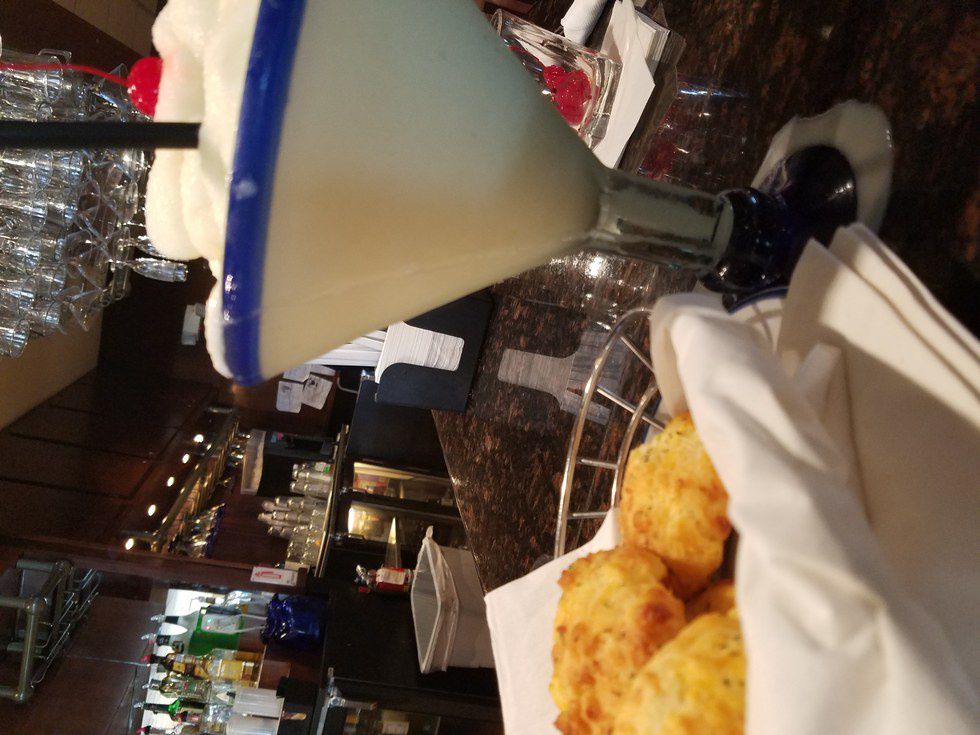 The hostess directed me to the bar where I could order cheddar biscuits to go. Still fascinated by my ability to purchase things with checks I wanted to buy my yummy snacks with it. The bubbly bartended approached me and told me about the drink specials. No. I needed to stay focused. I came for the biscuits.