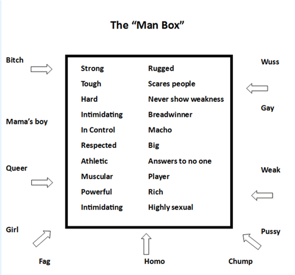 The box contains all the expectations for what a stereotypical "man" is supposed to be, and is reinforced by outside pressure like the survey results I gathered. Although many of the qualities in the box are positive, a fear that many of us have trouble overcoming is that stepping outside the box makes us less of a man.