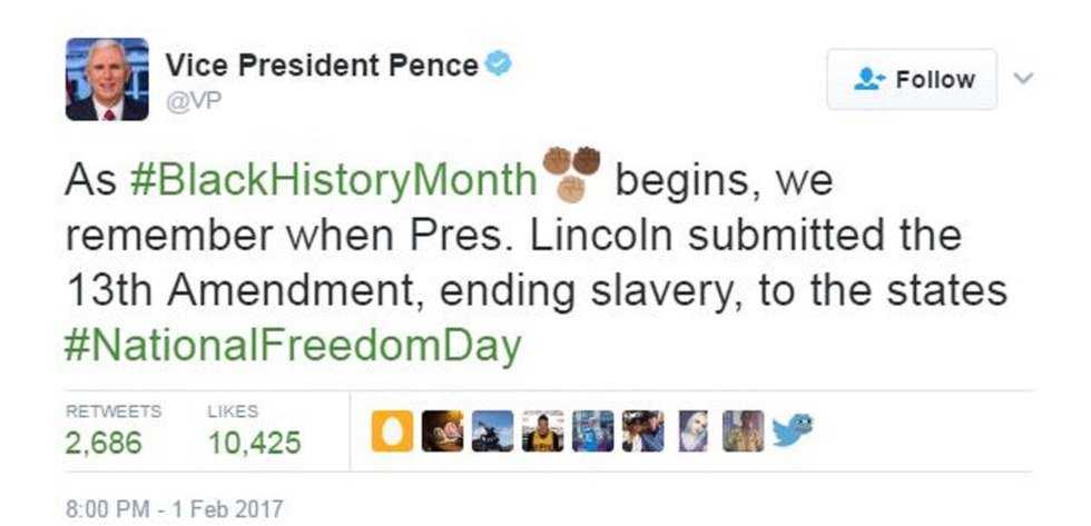 Black History month is a time to commemorate and celebrate black Americans, their contributions, achievements, and lives. Pence however, seemed to miss the memo, as he asked the American people to pay remembrance to Abraham Lincoln and the 13th amendment, which abolished slavery.