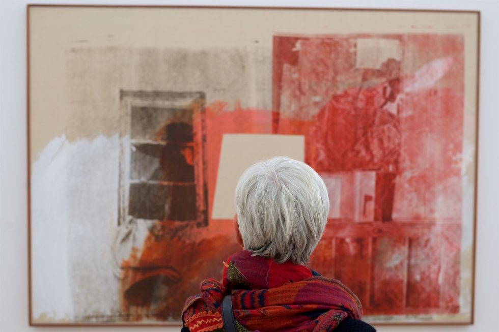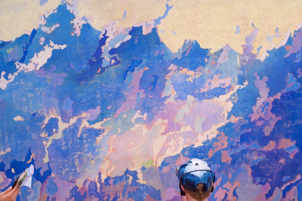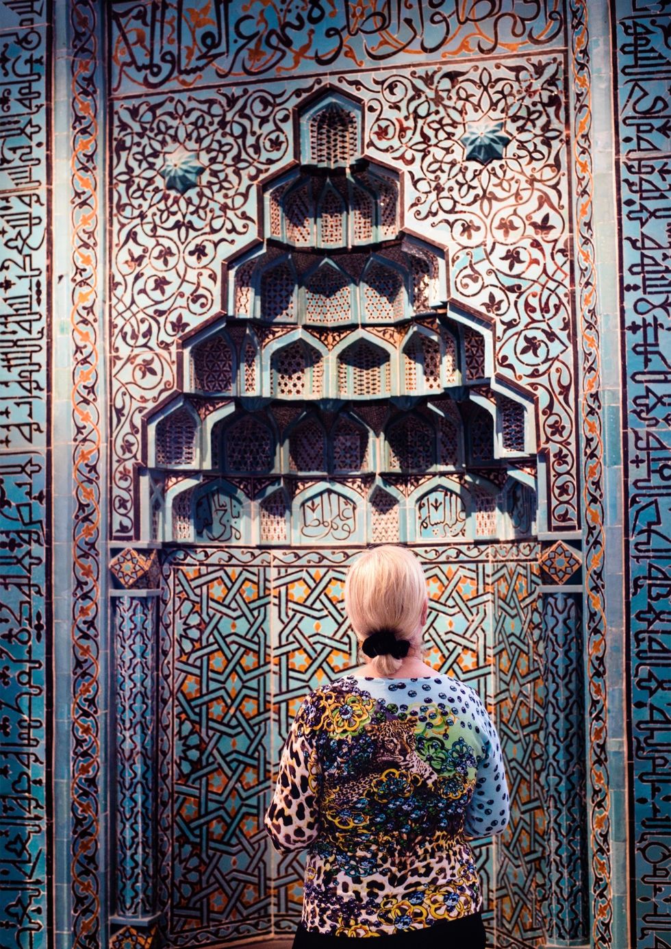 Each photograph captures an observer in front of a piece of artwork. The passerby's hair color, jacket color or the patterns on their clothing blend into the aesthetic of the piece itself in some way or form.