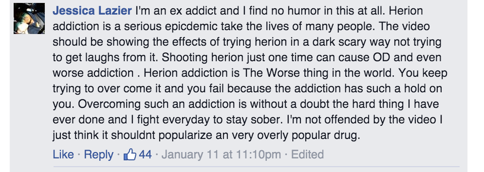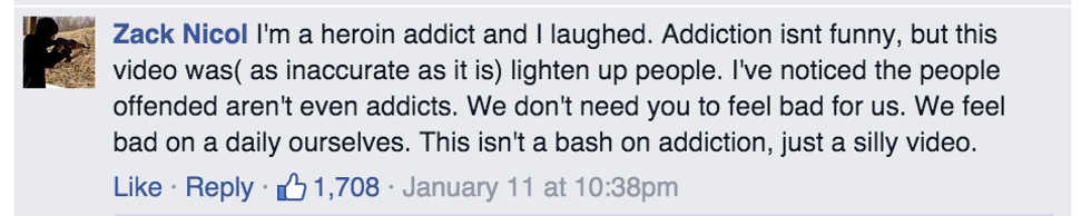 Both current and previous heroin addicts have also responded to the video. Some have said that the video really gave them a laugh, saying either it’s exactly what they act/acted like, or that it’s not realistic it all. Others said they were offended by the videos popularity for the wrong reasons, with one commenter saying, “It’s not as funny when you’re laying on your bathroom floor high and knowing you’re in trouble.”