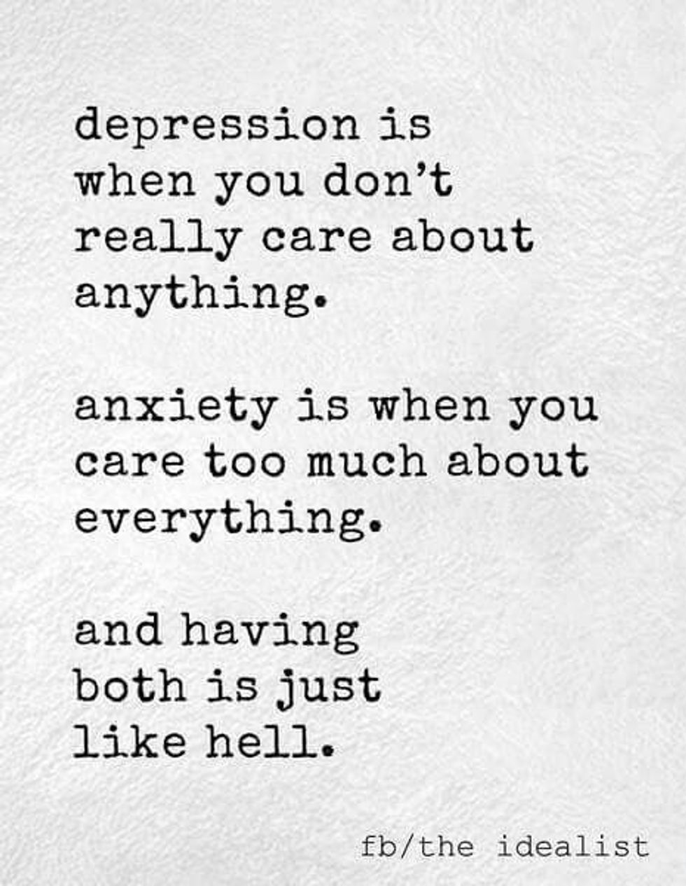 Do your research. Not many people even know what anxiety and depression are. Anxiety is a feeling of worry, nervousness, or unease, typically about something with an uncertain outcome. One can simply have anxiety about a test, event, etc. I, on the other hand, feel anxiety toward almost every situation I am put through. Depression is an illness that involves the body, mood, and thoughts and that affects the way a person eats, sleeps, feels about himself or herself, and thinks about things. Along with my anxiety, I have these feelings all the time.