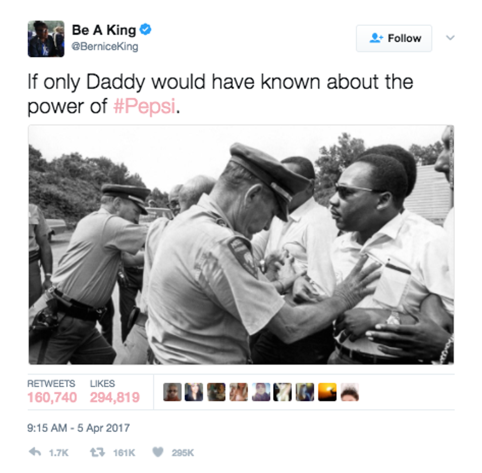Perpetuating the idea that a can of Pepsi can represent "peace" is highly offensive to not only current activists but the past and late social activists such as Dr. Martin Luther King Jr. Pepsi is downplaying the trials and obstacles that social activists face and have faced on a daily basis. The issue is not that Pepsi created an ad that calls upon social issues, the issue is that Pepsi went about it the wrong way. A can of Pepsi cannot protect protestors and activists from violence and police brutality. A can of Pepsi can never bring back the lives of those that put their own lives on the line for social change.