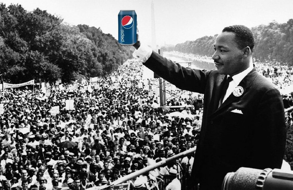 I have a dream that one day every Pepsi soda shall be exalted, every protestor and poster shall be made artificial, the competing corporations will be made plain, and the crooked Kardashians/Jenners will be made straight, and the glory of PEPSI shall be revealed, and all consumers shall see it together.