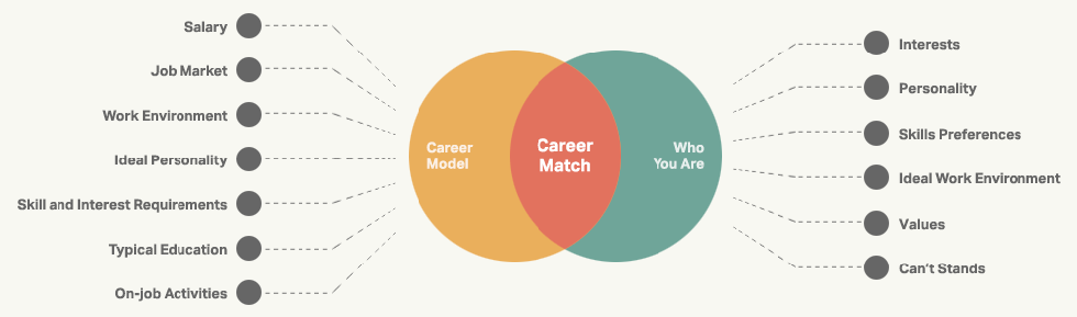 This 20-minute test assesses your interest, personality, and preferences. Along with your top career matches, Sokanu provides you with an archetype, trait, and personality profile. The archetype profile is largely based on the same categories used by the Holland Career Code test. The personality profile is based on high-level and fine-grained traits.