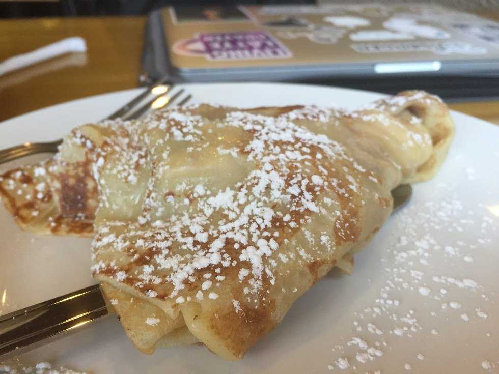 And I didn’t wait for that crepe long. Another cheery employee placed it on the table in front of me in record time, about ten minutes after I ordered. “Enjoy,” she said, and enjoy I did.
