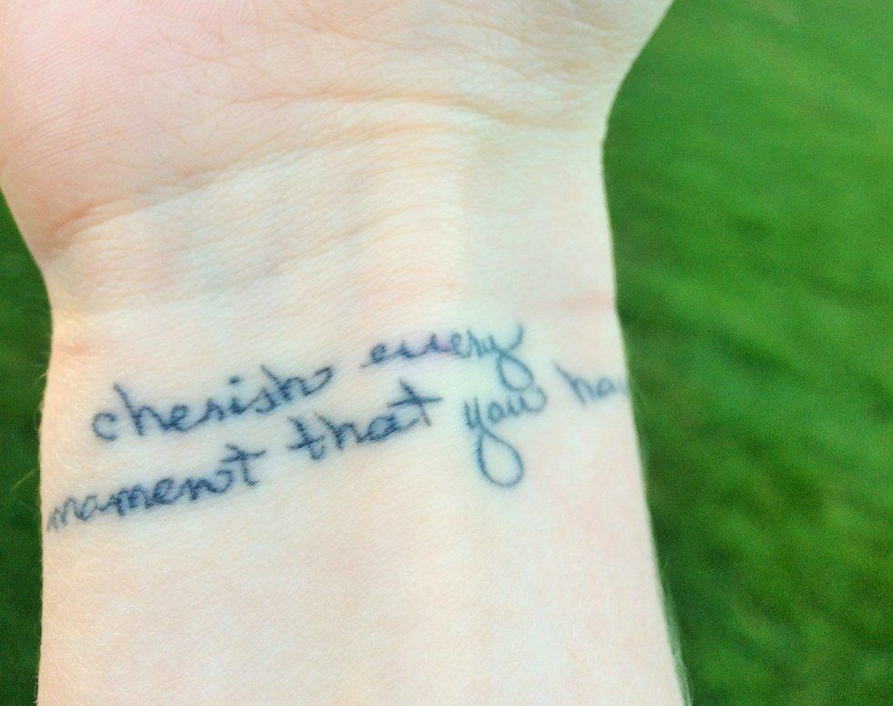 My tattoo says “cherish every moment that you have,” and it is in my grandmother’s handwriting. This phrase is something that she has written on all of my birthday cards ever since I can remember. It reminds me of the time that I spent at my grandparents’ house every summer. I consider it home. My grandmother is a guiding light and has supported me in everything that I’ve done, especially in helping to finance college. My tattoo is a piece of my grandmother that is with me for the rest of my life. It keeps me motivated and its placement on my wrist ensures that every day, every minute and every second, my blood is right underneath those words. Although it's permanent, these words are a natural part of my body now.