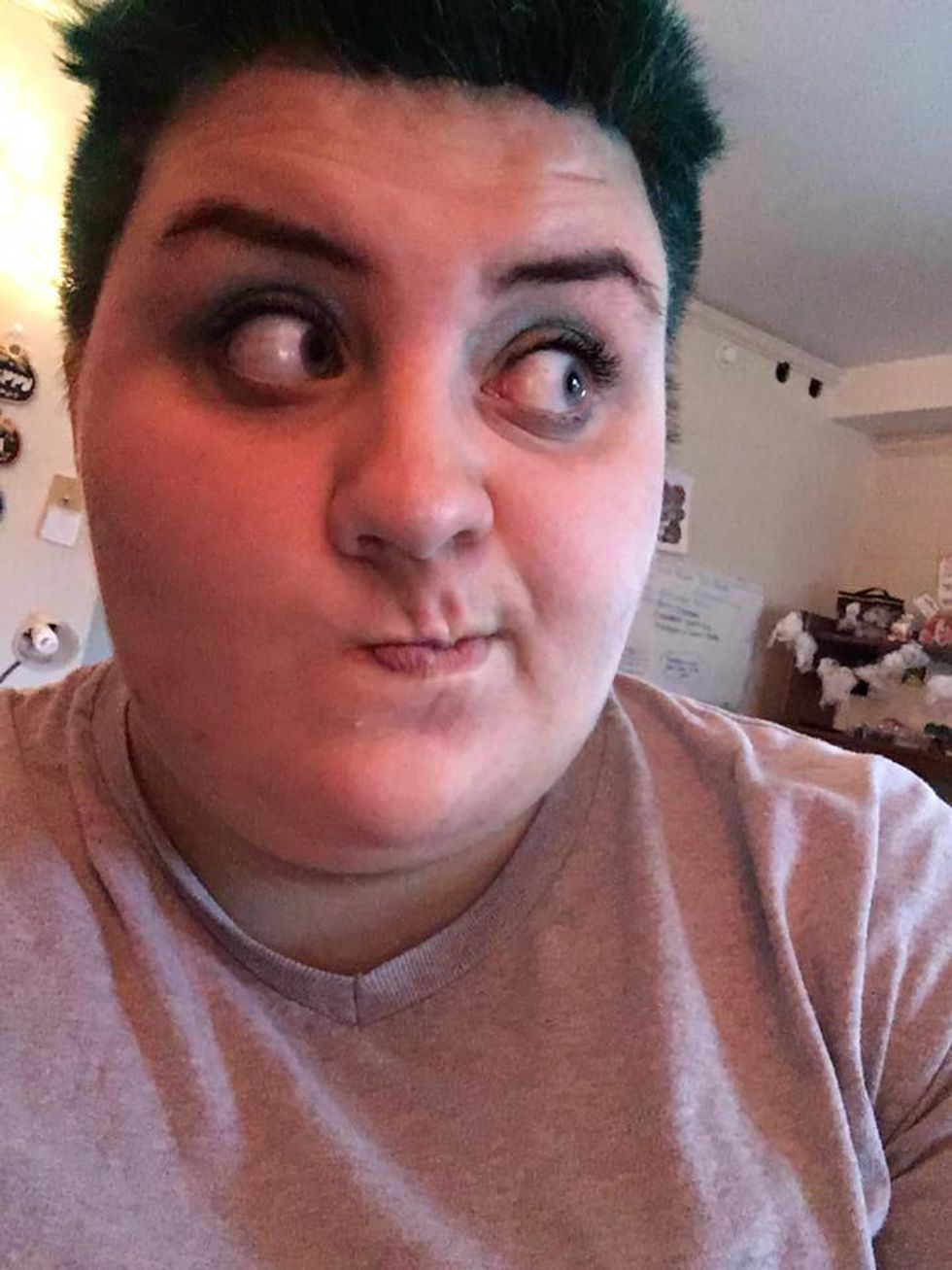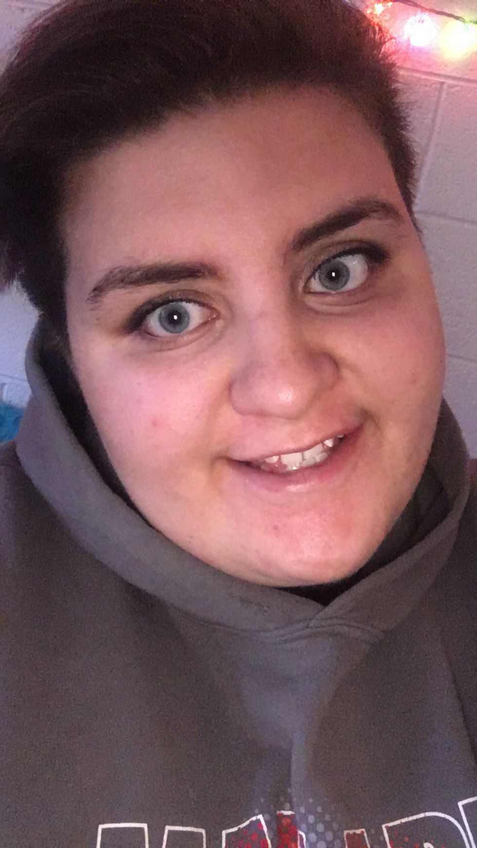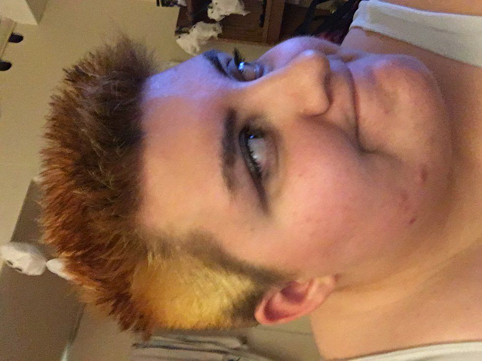 I thank my roomie for helping with this process because I couldn't I have done it without her. The first step was to bleach my hair so the color would show up. This step stays on for various times depending on how dark your hair color is. Since mine is almost black I left it on for an hour. After it's been on for an hour you are to rinse it out and let your hair dry before putting the hair dye on. Since my hair is shorter I only had to wait for about 15-20 minutes. Below: is a picture after I bleached my hair (sorry that its sideways)