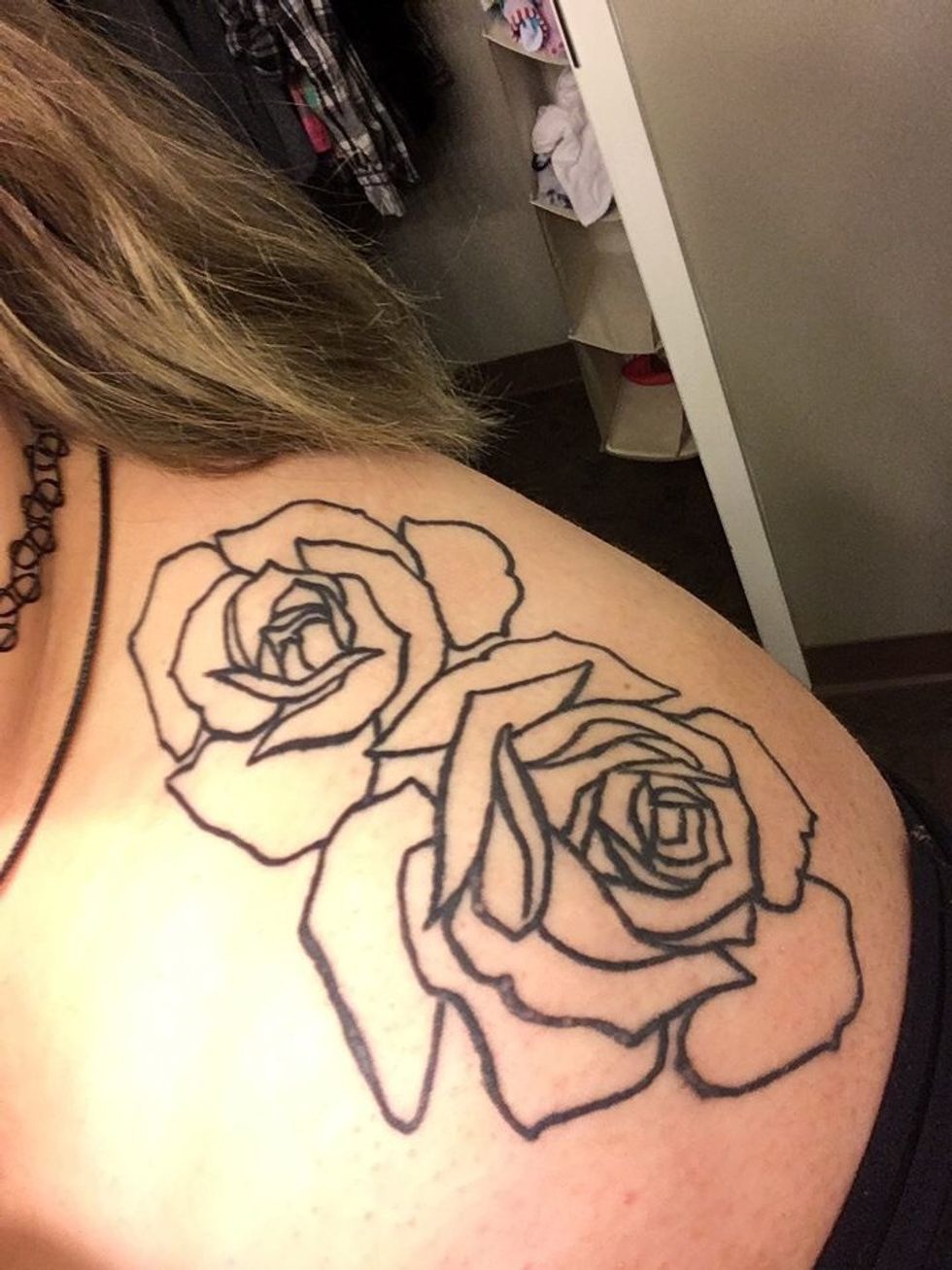 "Rose is both mine and my mom's middle name, so I have two roses on my shoulder that represent her and I. I also have a semi colon on my wrist that I did from the semi colon project. Then finally, I have an inverted triangle on my hip that was going to be a unicursal hexagram (a reference to one of my favorite books), but I couldn't finish it. Triangles are my favorite shapes though, so I love it." - Ash