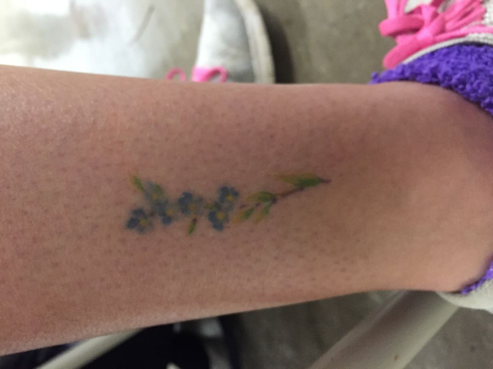 "I wanted my tattoo to be a reminder of all the rough times I've gotten through, but I wanted it to be happy and pretty. Not going to lie, I scrolled through Pinterest for a while for some ideas and found a picture of a very small forget me not on a girl's collar bone. This reminded me of the show 'Little Bear' where Little Bear gives his mom a forget me not flower and tells her to remember to always smile. I was sold on getting a forget me not. My tattoo artist designed one that was more detailed than the picture I showed him and he suggested a better, more inconspicuous place to put it. My tattoo reminds me of all that I've been through and also reminds me to keep smiling." - Myself