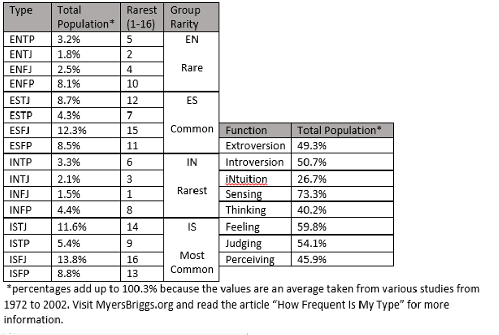 Personality frequencies change on a country by country basis, as some countries have societies that encourage certain personality types. In the United States, Sensing and Feeling are some of the most common traits. Below is a layout of type frequency information taken from the United States.