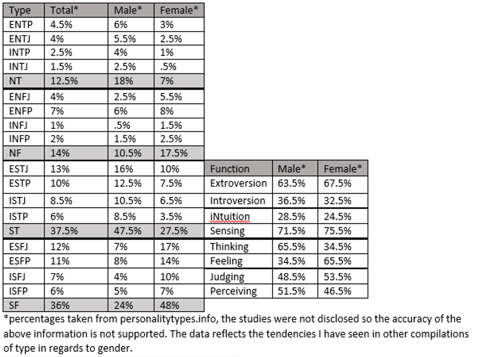 Personality Type frequency also changes based on gender. Women are more likely to be Feelers than men, which can explain societal expectations and “gender roles” in the United States.