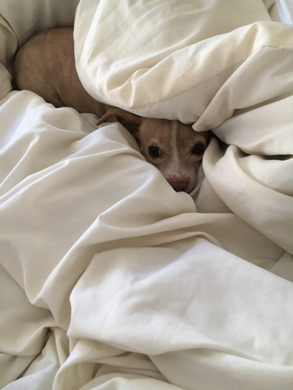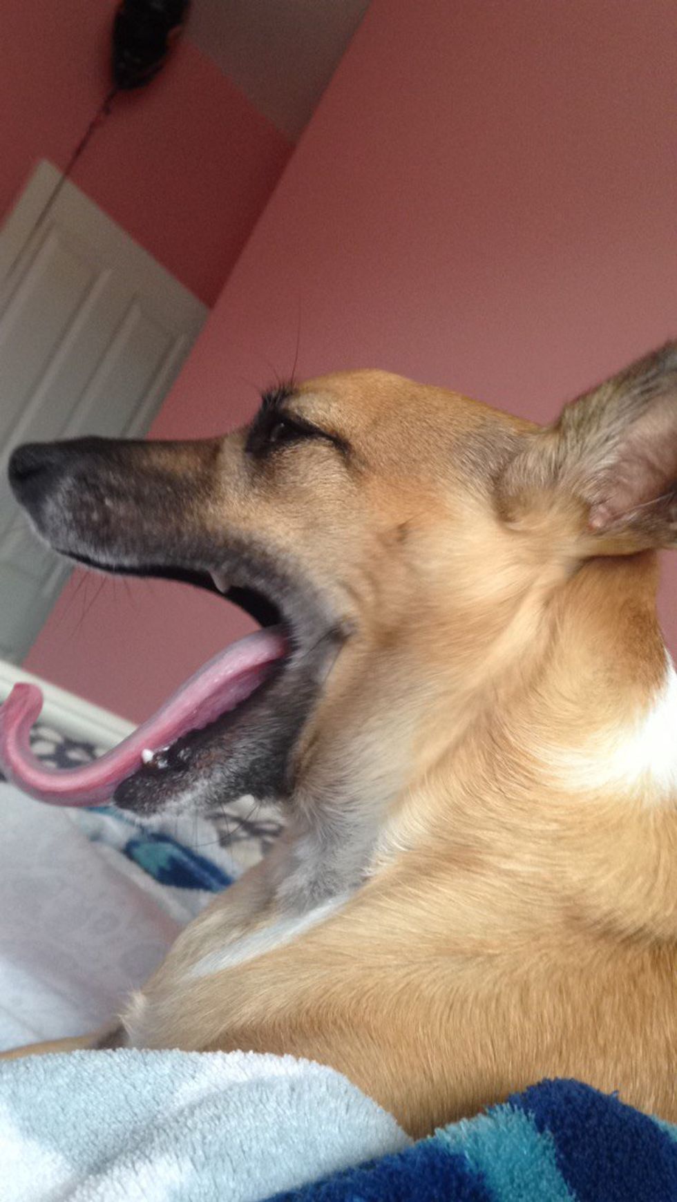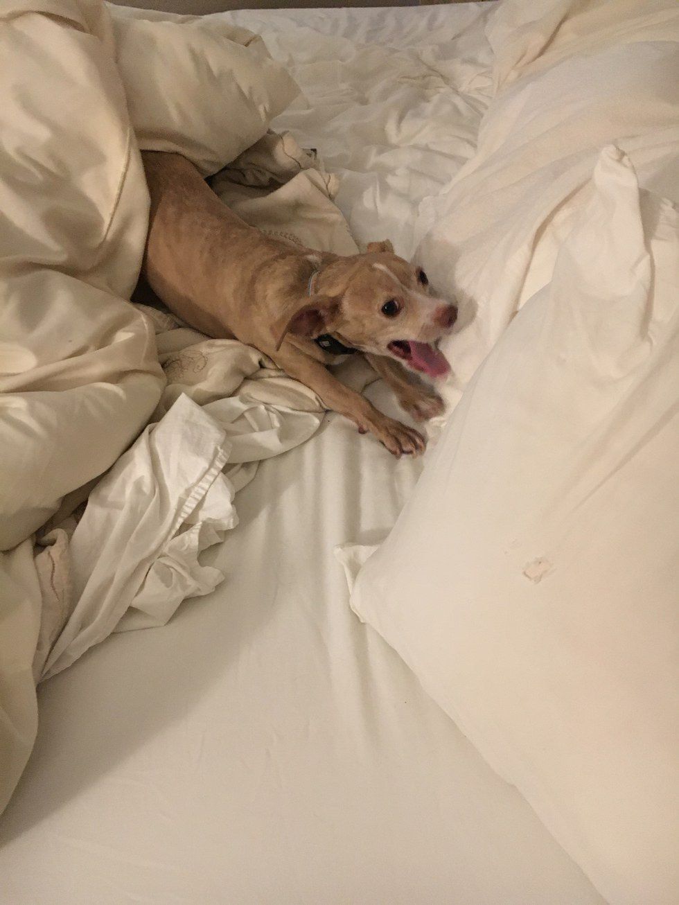 Pinky is a ridiculous creature who likes to sleep in human beds. In fact, she spends the vast majority of her time sleeping, when she's not begging to be cuddled, or chewing on a bone.