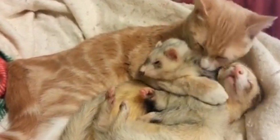 Ferrets enjoy cuddling up with fuzzy cats when they're tired and vice versa. (Just make sure both of the animals are about the same size)