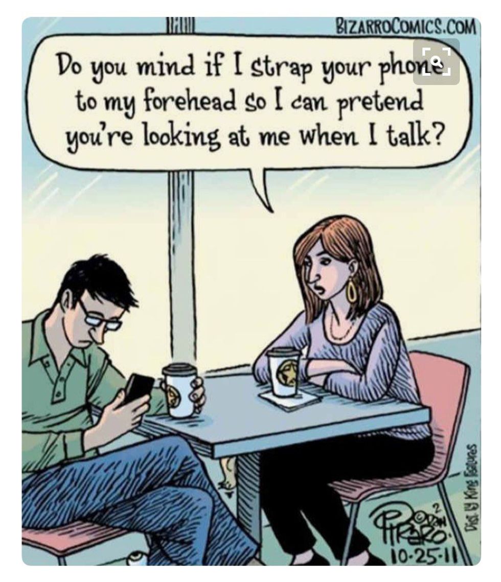 I get it, phones are a break from boredom, you want to stay connected with everyone all the time. However, I am sure you have plenty of time to do all your phone browsing when you are not with other people. This has become a big problem these days and it is truly sad to look over at a group of people not speaking to each other. Phones can be used as a source of entertainment for the group, but if you are just checking Facebook, Instagram, whatever, it can wait. Also, it’s a domino effect, once one person brings out their phone one by one the other's will. Do you realize how awkward it is to be at a meal with someone and they get on their phone. You want so bad not to be one of those people, but it is less awkward than just sitting there staring at someone play on their phone…