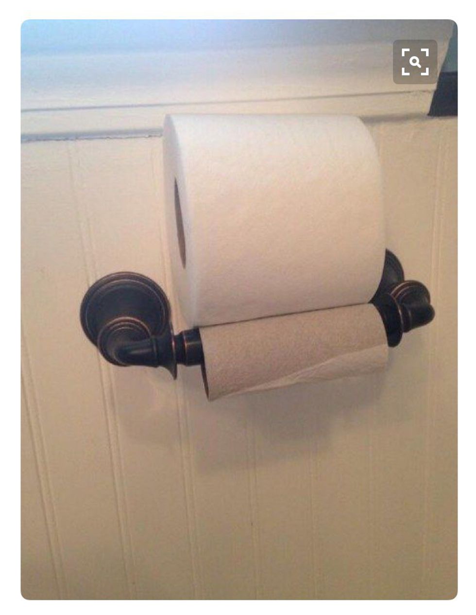 It takes less time to replace the paper roll then it does to actually go to the bathroom. It’s really nice of you to get a new roll in the bathroom, but you’ve come so far, don’t put the roll on top and make someone else do your job. You finish it, you replace it.