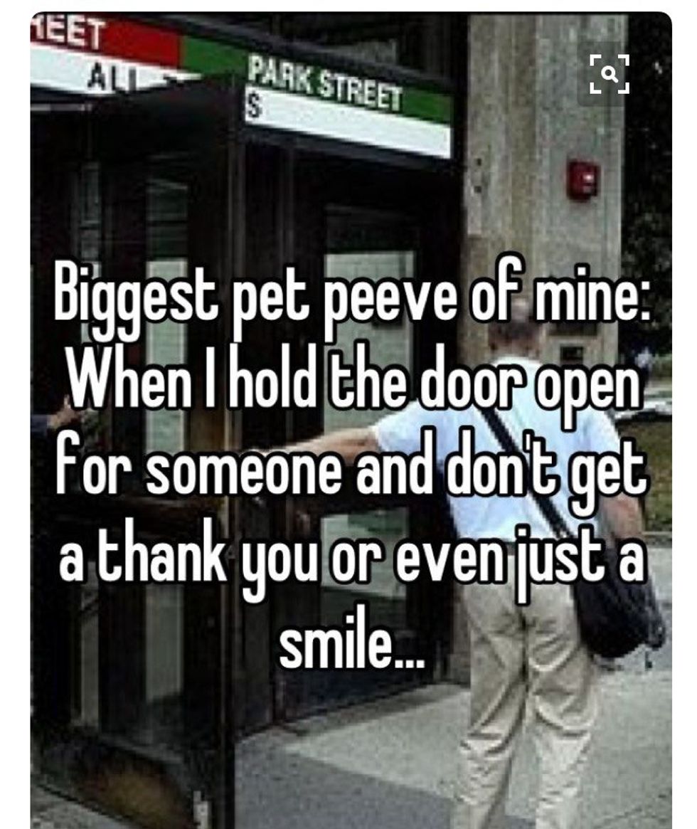 Do you have any pet peeves, just anything that people do that really gets under your skin? Sometimes you think “It’s not that difficult, it’s common courtesy.” Well I’m gonna guess that we all do and unfortunately most of these inconvenient or frustrating things can be avoided. Now I’m not talking about people who chew or breathe too loud so you can’t even hear the television or sag their pants so low that everyone can enjoy their cleverly decorated underpants. Although those things can be highly distracting or a serious TMI moment, these types of things cannot be helped or are based on personal fashion. But today I am talking about the “Common Courtesy” pet peeves, actions that should not be asked for and should not rewarded when done. Actions that any basic human being with any knowledge that they are not the only one living on this earth should be taking. Actions that have become so rare that they have been labeled “pet peeves” by anyone who has the nerve to bring them up. So rare that they are filmed and then posted on the internet with headings like “I still have hope in humanity” or “see people do good things too” or “need something to brighten your day?”