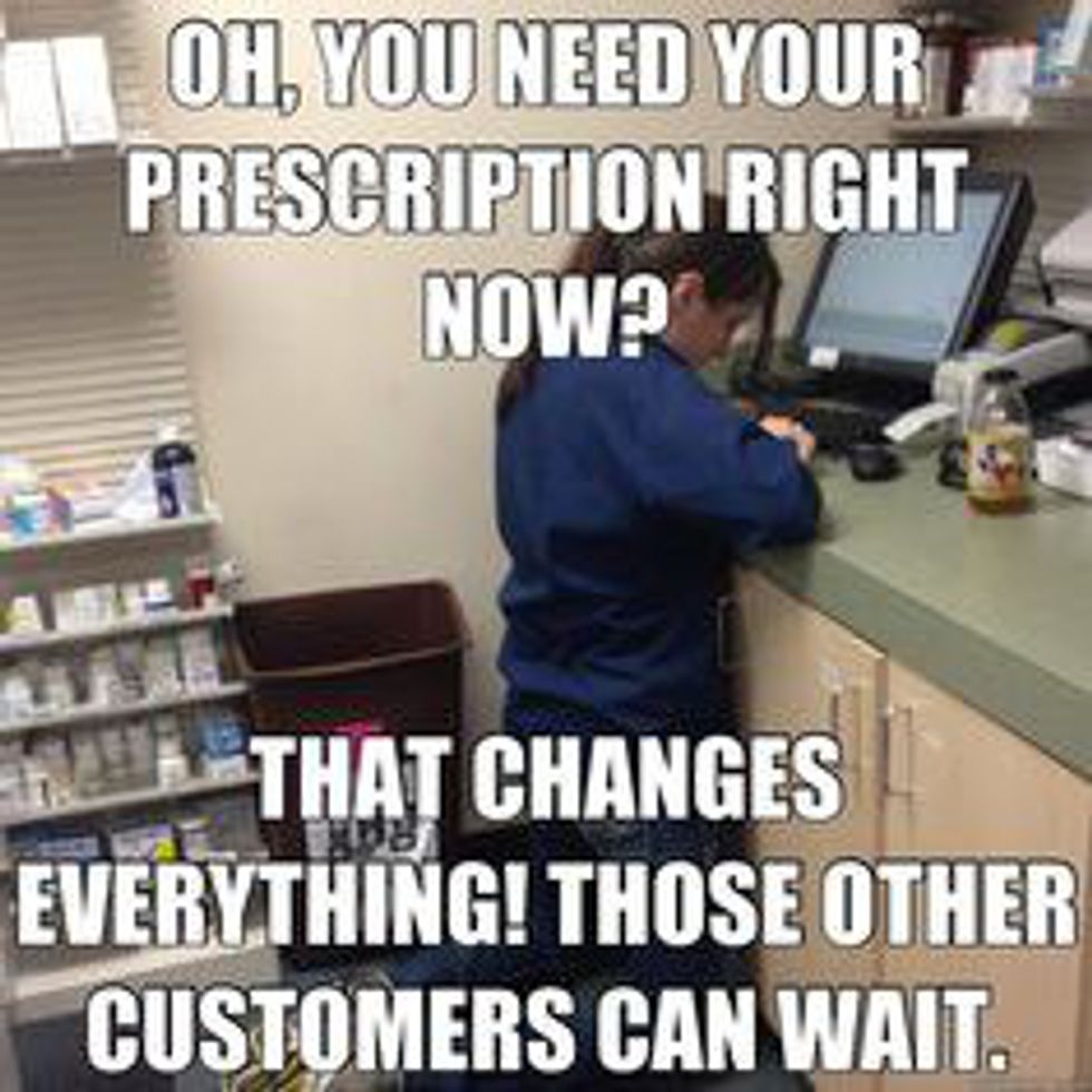 I get that you probably live a busy life, but if everyone else ahead of you has to wait for 15-20 minutes, then so do you. I know it's hard to believe, but you are not our only patient. You should be more patient with us since rushing your medication can only cause mistakes. It is very important for us to follow every step in the process to ensure you get the correct medication and quantity. Against popular belief, there is way more to getting your medication ready other than just throwing some pills in a bottle and putting a label on it. Also, just a little tip, gathering around the counter giving us death looks will not get your prescription completed faster.