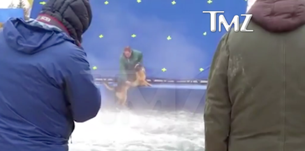 In the video you can hear one of the crew members laugh at the dog's struggle and clearly say, "You just got to throw him in." According to TMZ the film took place in Winnipeg, Canada. The German Shepherd was one of at least 5 dogs used throughout filming.