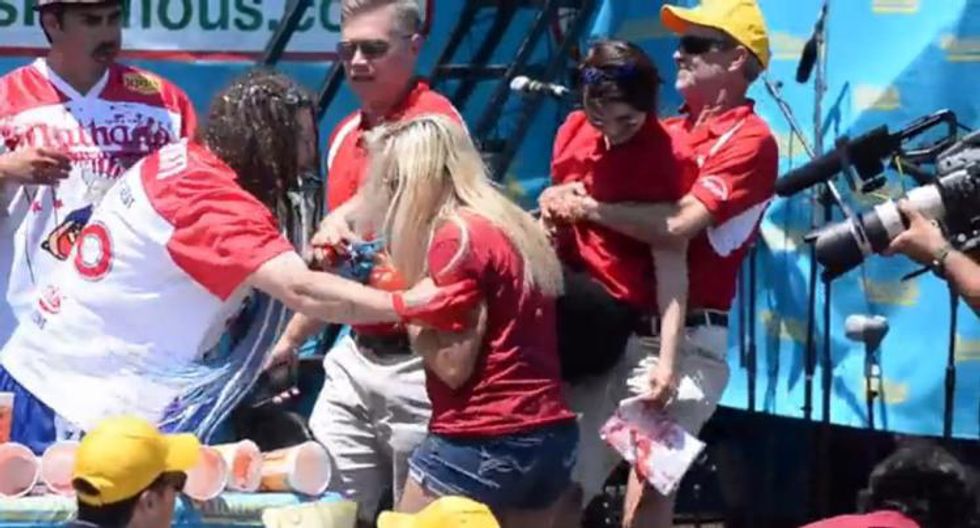 Finally, who do these protesters think they are? Fourth of July is America's birthday. America, the land of the free, so if these competitive eaters want to stuff as much food down their throats as they want, let them. Don't ruin an American tradition, like Nathan's. Protest on July 3rd, or July 5th, but not on the Fourth. Go to a cookout, have a couple stews and celery sticks, and leave meat eaters alone. Shout out to the security guards that wrangled these hooligans like they were cattle. They threw them off stage into the waiting arms of other security guards in a matter of seconds. One last point, these are the most selfish animal rights activists out there, people want to see records, but no these clowns had to rush the stage and rattle the minds of the contestants Joey Chestnut would have eaten 100 hot dogs if it wasn't for these guys, no doubt in my mind. The world got robbed of the greatest eating feat of all time.